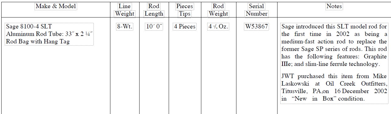*Sage Model SLT 8100-4 10 8w. 4p. Dark olive brown blank wrapped brown/gold/black over chrome snakes and dual ceramic ring strippers, hook keeper, 7 full Wells, U/L black anodized screw lock with affixed fighting butt. Blank excellent, grip soiling. Original bag and tube. $350 plus shipping. SOLD!