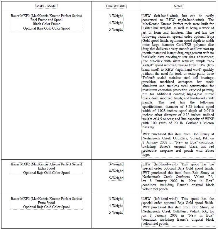 As with the other items in the Tinko Collection, I am reproducing his notes as shown below. Condition: The Model 1 reel is lined, but is in otherwise as-delivered, unused, mint condition. Model 2 is mint, unused, and as delivered. Both reels come with their original care sheets and shipping boxes, as packaged at the times of delivery.