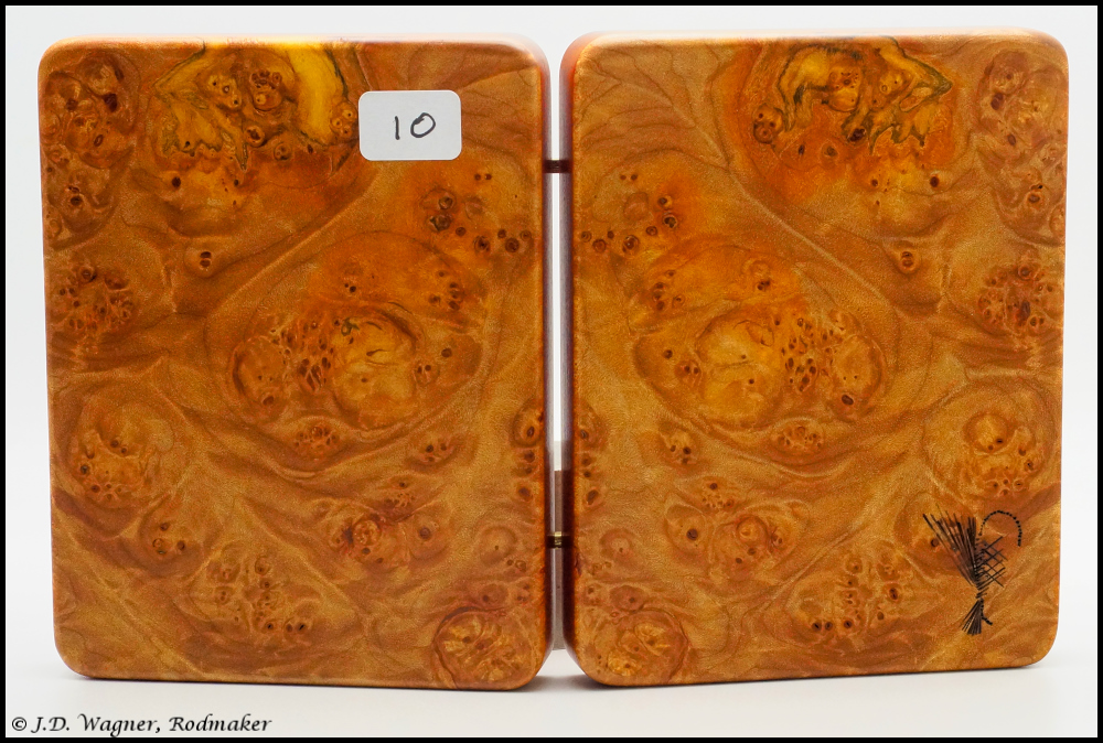 10. Carson Woodworks, burled oak, 3 ¾ x 4 ¾ x 1 1/3, lacewood sides, engraved, foam inserts $100 SOLD!