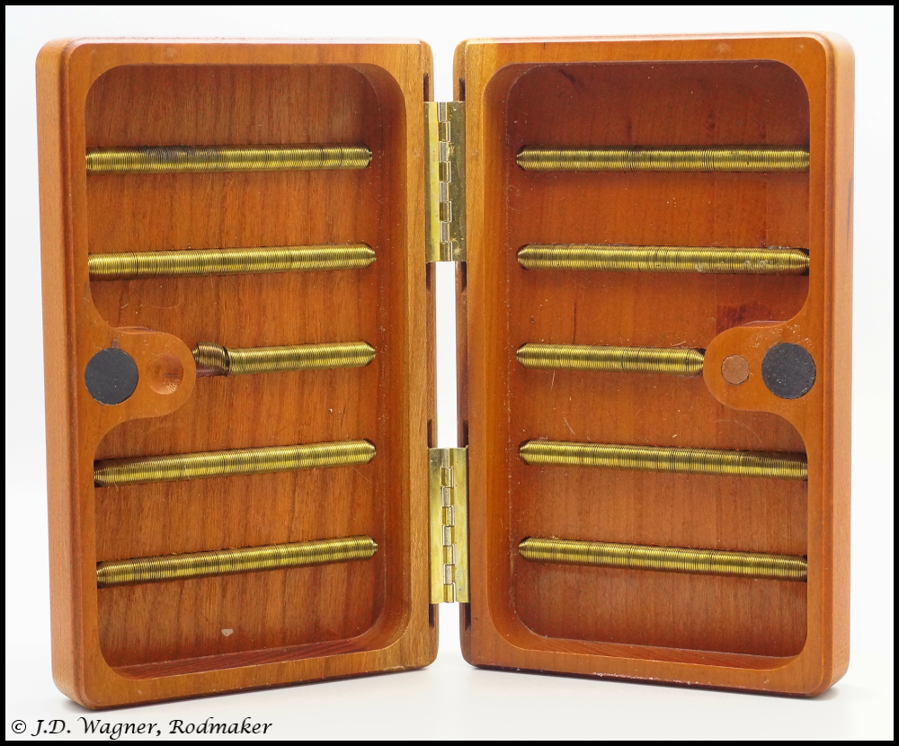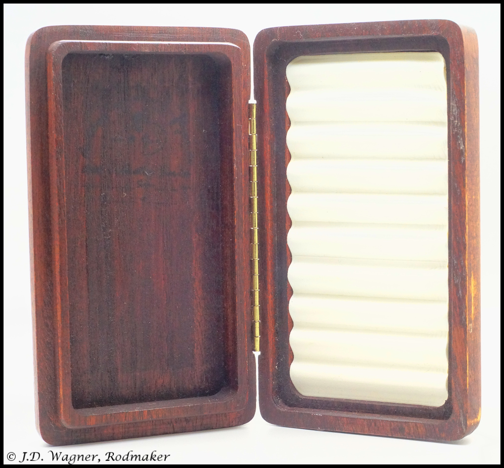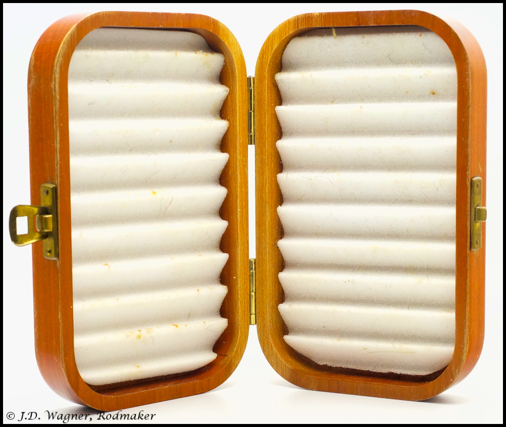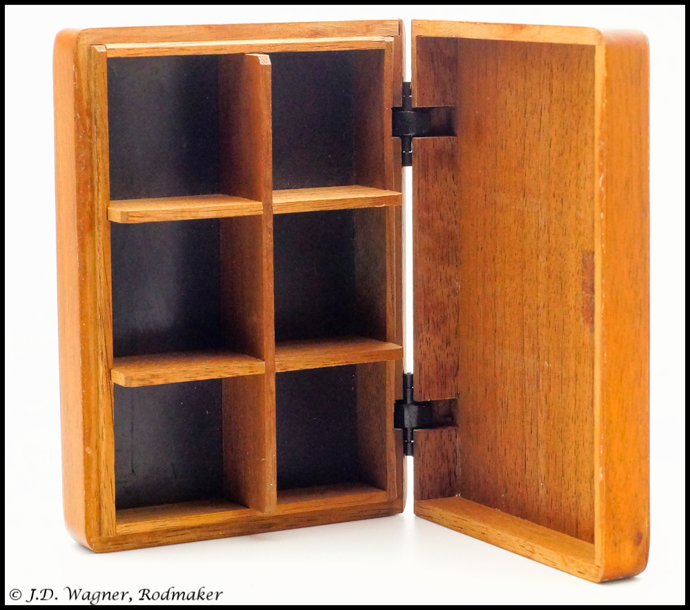 This flybox (and #31)was made by J.D. Wagner. Before we began making rods we got our start making wood rod cases, fly boxes and a few nets. These items were sold through Valley Angler, Chagrin Falls, Ohio. One day while visiting the store to deliver some boxes I found a book about making bamboo flyrods. The rest is history......-ed.)
