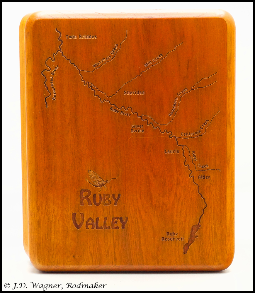 26. Ruby Valley box by Stonefly Studio, cherry, router made, machine engraved map of Ruby river valley, foam inserts $30