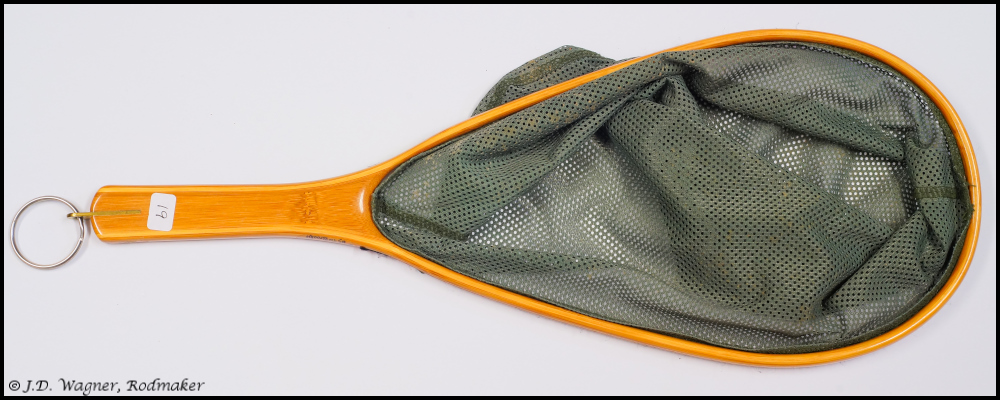 19. Bamboo Net Company, The Brookie, #3, bamboo bow & handle. Super light, nylon bag, 5 ½ handle with brass O ring and brass inlay, gorgeous, as light as a feather, 12 ½ x & bow $200 SOLD!