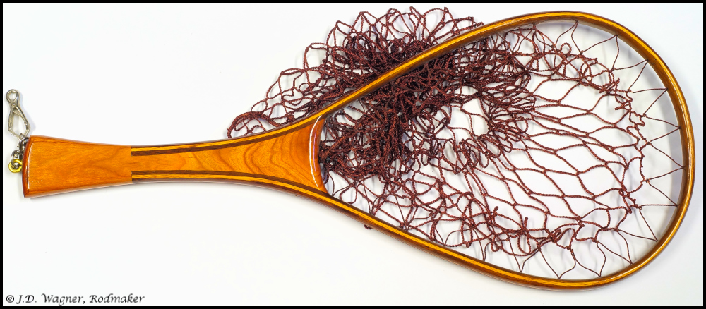 24. William P. Karduck net, August 17, 2001, Montana and Wisconsin. Cloth bag, cherry & walnut & ash, 6 ½ handle, 12 x 9 bow, #1538 $165 SOLD!