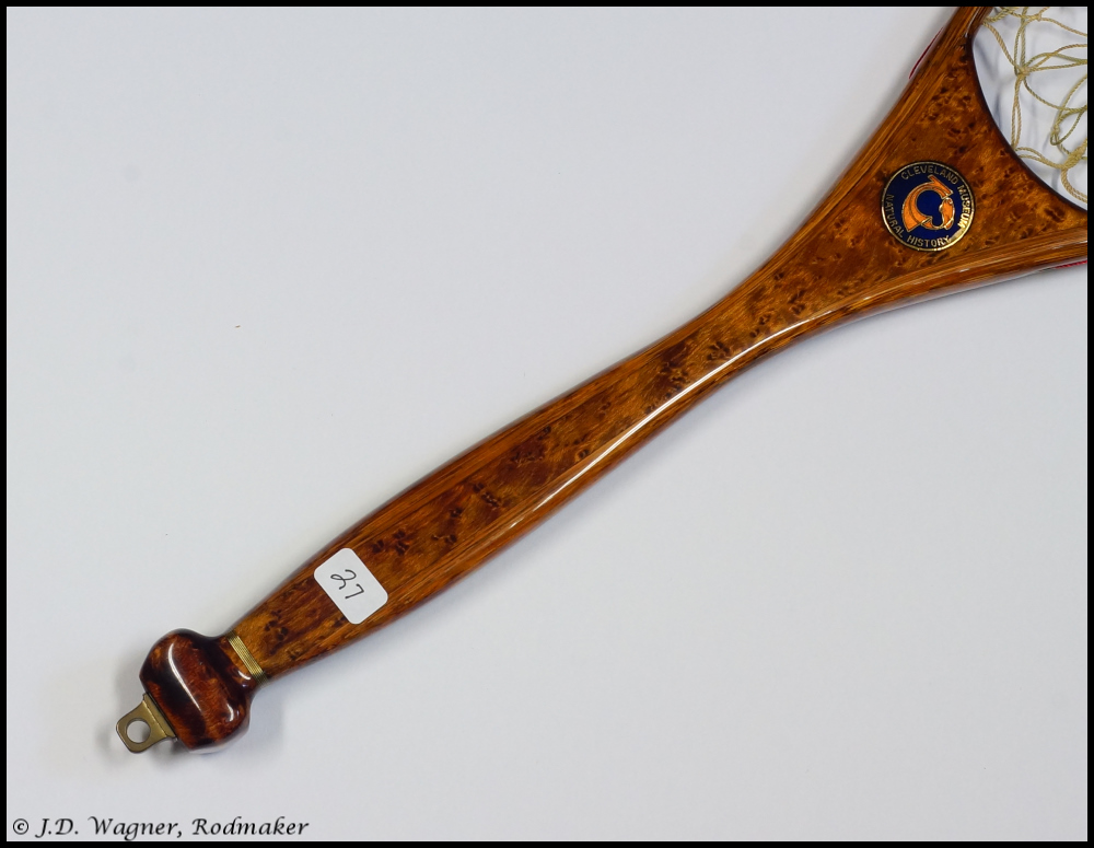 27. Ron Reinhold, Boardman Model (Tonkin), Gorgeous burled oak, 1995. Beautiful medallion inlay on throat of net Cleveland Natural History Museum Trout Club, truly a work of art, 12 handle, 16 x 10, Tonkin cane bow. $400 SOLD!
