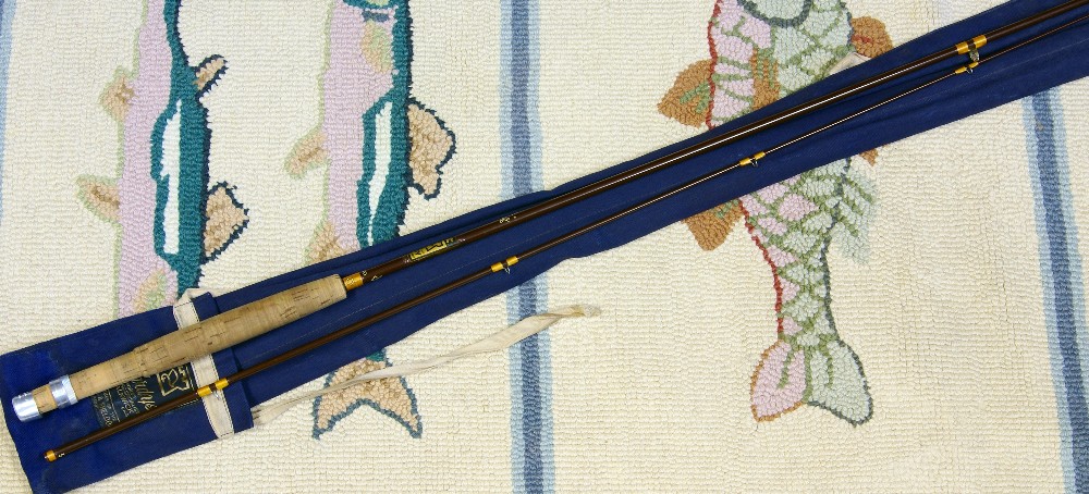 Hardy Palakona 7'2" 2p 2t for 5 wt line. Blond Hardy cane w/ 3 x 3 node spacing, reverse twist snakes and agate stripper wrapped in black thread tipped green, oxidized brass ferrules with very little bluing wear, varnish very good, writing intact and in typical Hardy spiral form, clean diminutive cigar grip w/D/L aluminum knurled ring and hooded screw on retainer stamped in Hardy fashion, aluminum ferrule plug. Serial number I/Y inked on rod shaft. Original bag and tube. No sign this rod has ever been fished excepting some light scratches on the aluminum end cap. $795 SOLD!