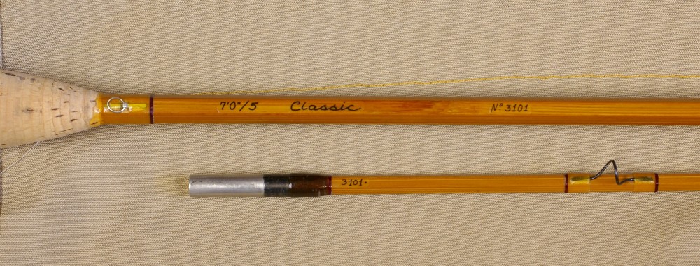 Thomas and Thomas Classic 7' 2p 1t for DT5 line, serial number 3101(1978). Impregnated. Medium flamed cane, 3 x 3 node spacing. Perfection guides and Mildrum stripper wrapped in off yellow translucent silk tipped cinnamon, dark brown silks at ferrules, 5" cigar grip terninating in superfine-type profile w/hook keeper above, D/L aluminum cap and ring with varnished walnut spacer, oxidized NS ferrules.